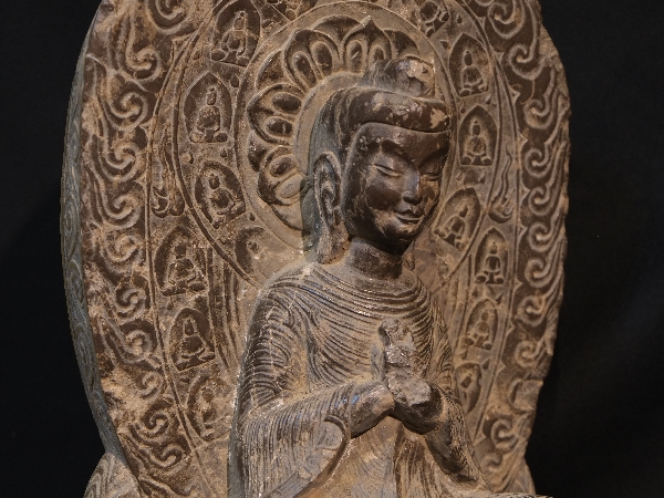 古代中国に仏教が伝わって間もない頃の南北朝時代(東魏)に造られた交脚菩薩像である。本体裏側には釈迦が悟りを広める場面が彫られ下部には元象六年四月八日と銘が入る。